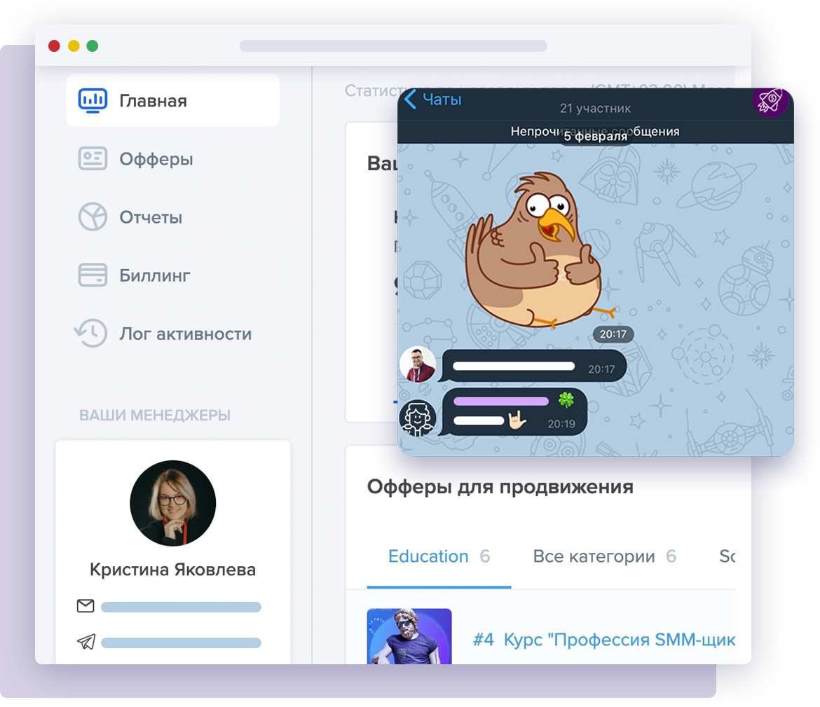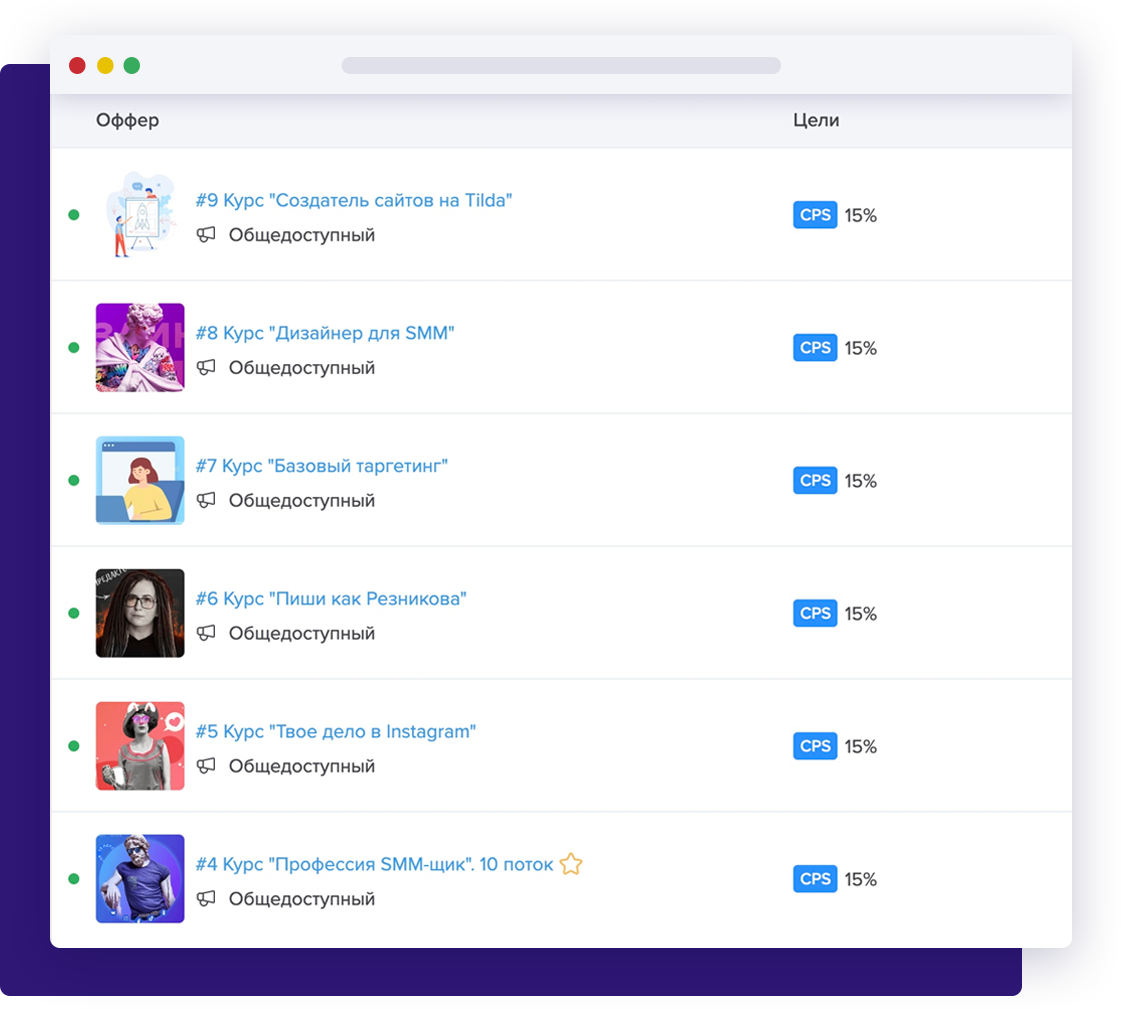 Сможете сами выбрать любой образовательный курс для продвижения (оффер), рекламные макеты и отслеживать динамику конверсий и выплат по ним.